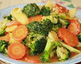 花开富贵:'1.菜花一朵朵切下,先用盐水浸泡10分钟,再用开水氽烫过捞出;2.胡萝卜去皮,先煮熟,再切滚刀块;3.土豆去皮,切滚刀块,用盐水先漂过,再捞出沥干;...    详细介绍
