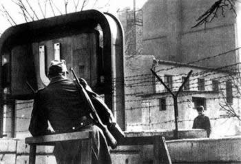 8月12日午夜过后半小时,黑暗无人的大街上警笛狂鸣,矮 墩墩的T-34和T-54型坦克带领着满载德国军队的卡车直奔东西柏 林之间25英里长的边界线。头戴钢盔的东柏林警察乘卡车前往主 要通道站岗。士兵从车上卸下木马、铁丝网、水泥桩柱、石块、 镐头、铁锹。4小时后日出之时,一堵墙的墙基已经形成了。4天以后,墙就完全建起来了,当时仍然留在东柏林的德国人便从此 被禁锢起来,直至1989年。