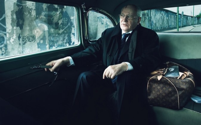 前苏联最后一任领导人戈尔巴乔夫。背景是柏林墙